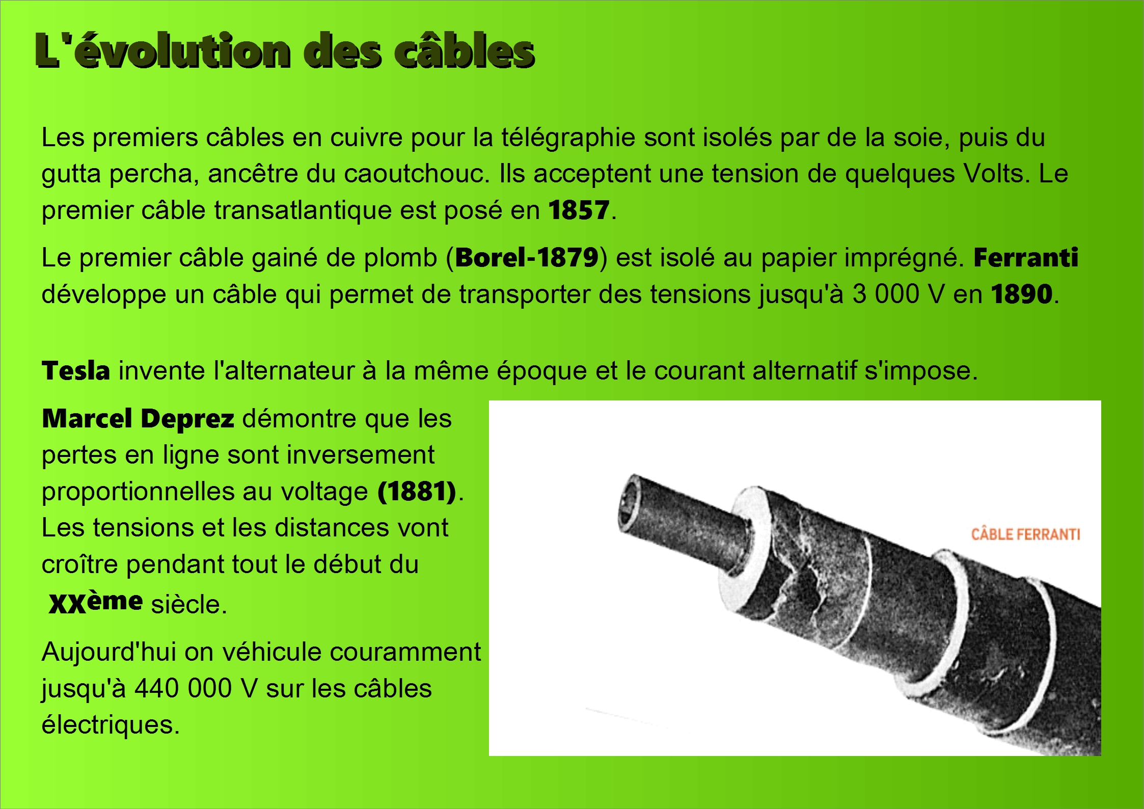 Jusqu’en 1880 on ne savait pas transporter le courant sur de grandes distances. Il a fallu plusieurs dizaines d'années avant de savoir isoler les conducteurs et la découverte du transformateur va permettre de monter en tension. Au moment de l'exposition de 1881 le problème n'est pas encore totalement résolu.