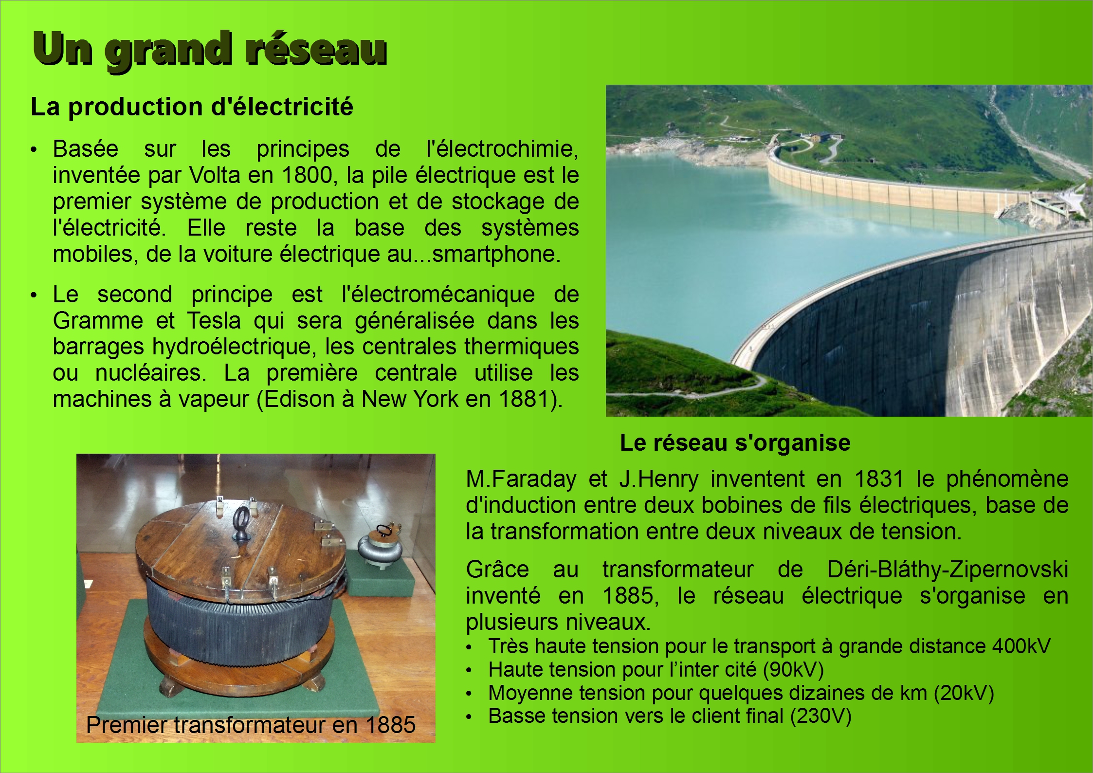 L’ensemble des pièces du puzzle électrique, l’alternateur, les câbles, le transformateur vont se conjuguer pour créer un grand réseau universel. Restait à trouver l'énergie qui permettait de faire tourner l’alternateur. Toutes les sources d'énergie ont été mises à contribution:
